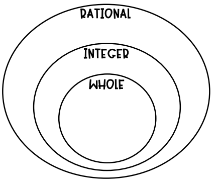Rational numbers | arrow_right_alt | Numbers that can be written as fractions, repeating decimals, or terminating decimals (Examples: 1.2, 3/4, -0.5, -8/4, -2.0,...) |