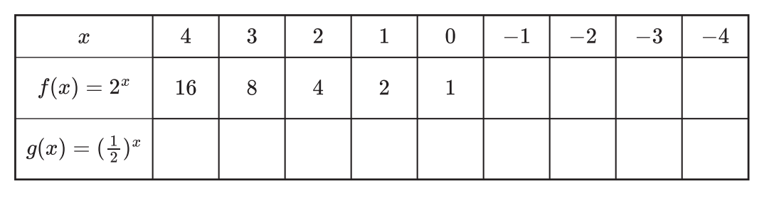 (The y-values of inputs with negative exponents are the reciprocals of the y-values with the opposite positive exponents.)