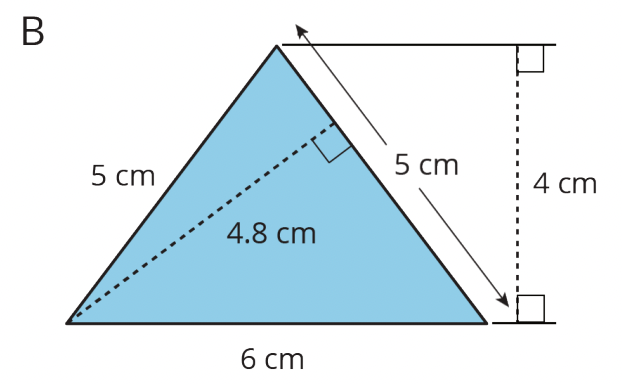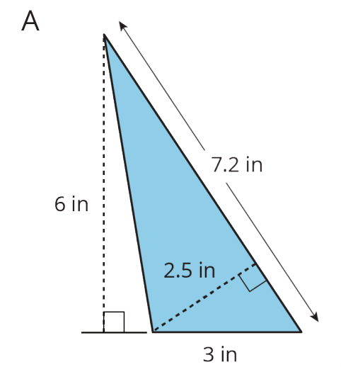 For each triangle, identify a base and a corresponding height. Use them to find the area. Show your reasoning.