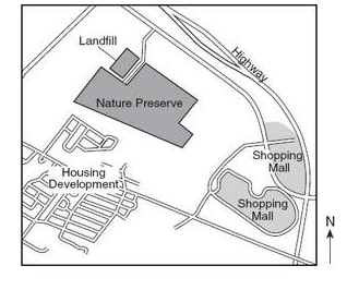 The map shows the location of a nature preserve and the surrounding area. The preserve is an ecoystem that is home to several endangered species.