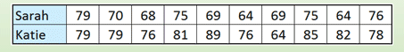 Sarah and Katie record their ten best times for a swimming race. The times (in seconds) are shown below: