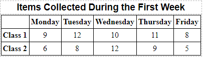 Two classes are competing in a challenge to collect 75 items for a local food bank. Items are only collected during school days. At the end of the first week, they created the table below to show the number of items collected each day. They also calculated the mean number of items each class collected per day.