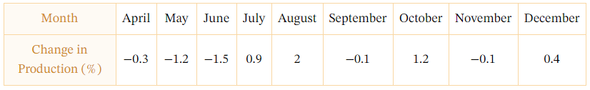 The table shows the percentage change in a factory production over 9 months.Calculate the interquartile range of the given data.