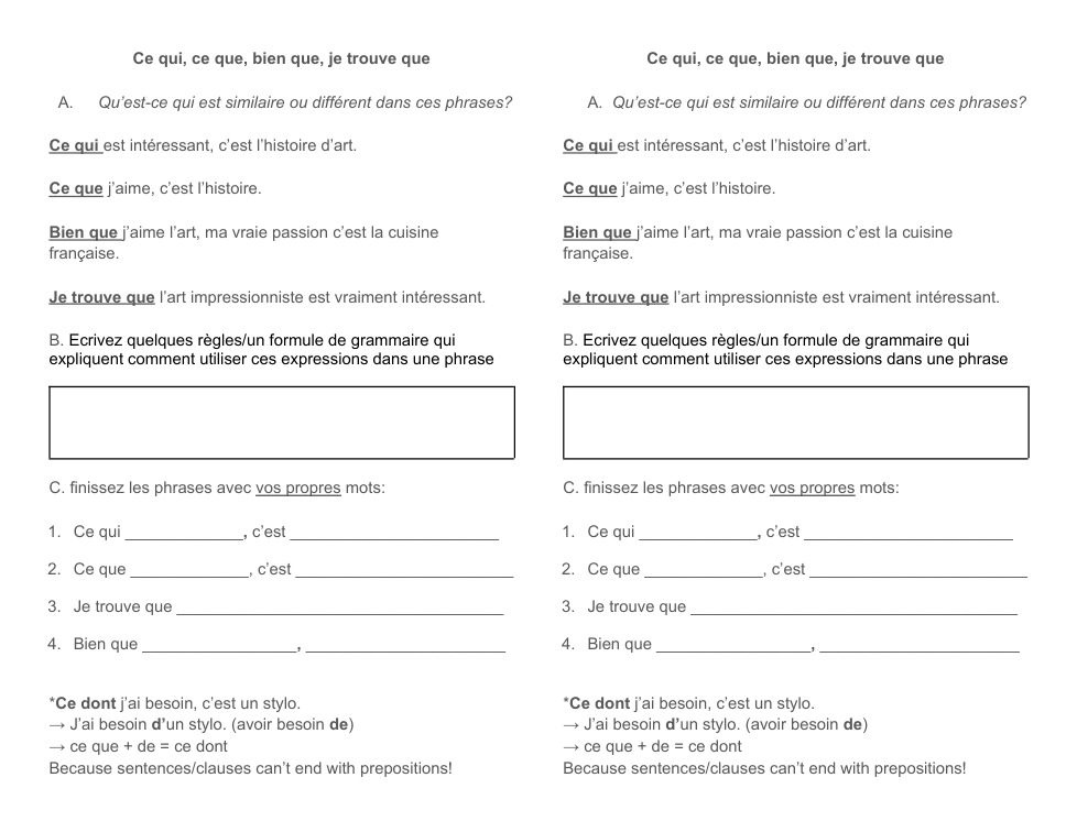 What do you notice about the following sentences? Similarities? Differences? Ce qui est intéressant, c’est l’histoire d’art.Ce que j’aime, c’est l’histoire.Bien que j’aime l’art, ma vraie passion c’est la cuisine française.Je trouve que l’art impressionniste est vraiment intéressant.