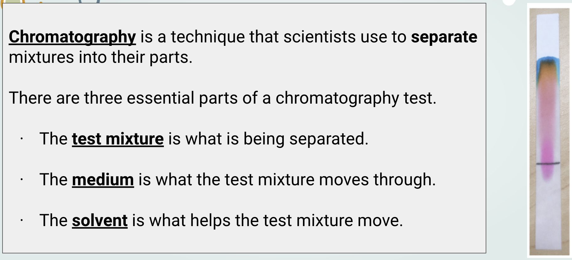 In our chromatography experiment, what was the test mixture, the medium, and the solvent?