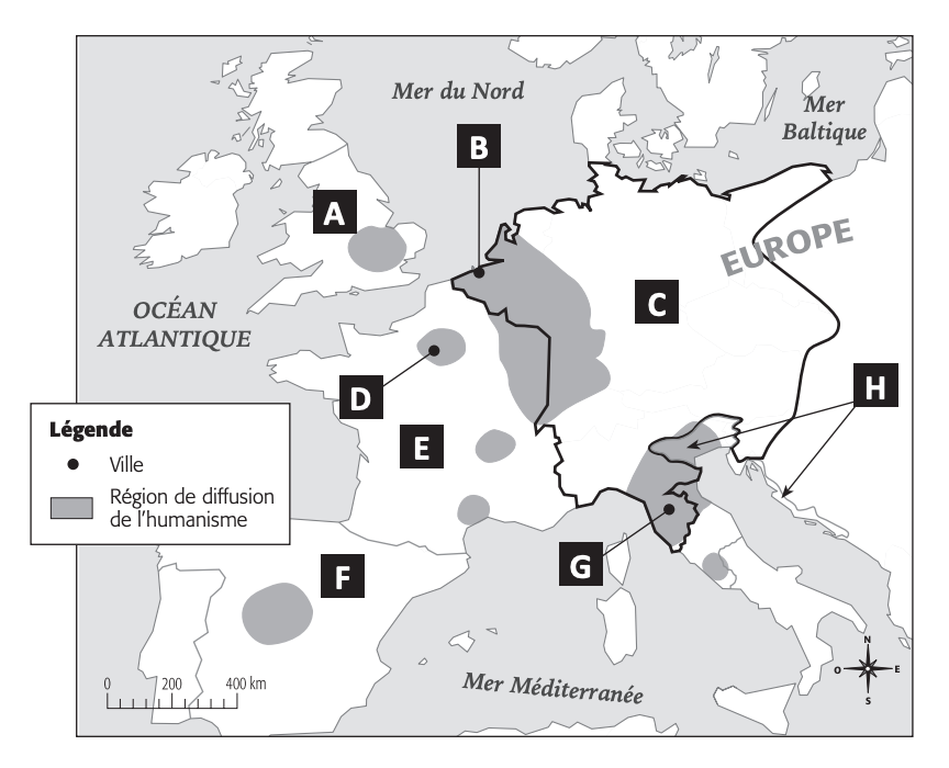 La Renaissance s'est d'abord implantée en Europe. Associe les foyers de la Renaissance avec les bonnes lettres.