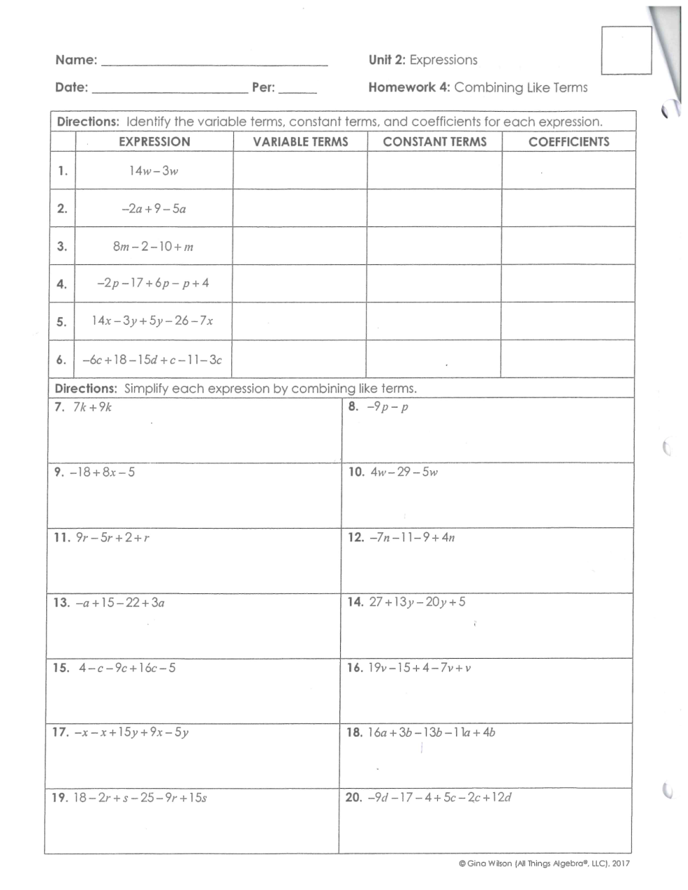 Unit 2a-2: Combining Like Terms