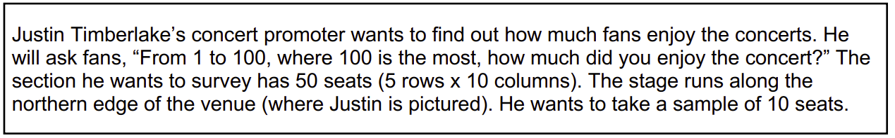 Explain your method in detail below. Then use "Show your work" to actually indicate which seats you chose. You may use random.org