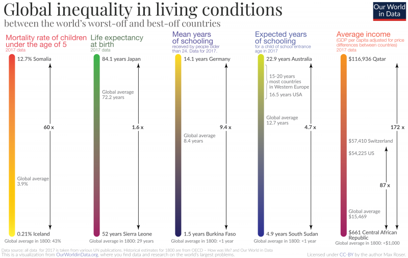 Our individual stories play out amidst these major global changes and inequalities and it is these circumstances that largely determine how healthy, wealthy, and educated each of us will be in our own lives. Yes, our own hard work and life choices matter. But as we will see in the data, these matter much less than the one big thing over which we have no control: where and when we are born. This single, utterly random, factor largely determines the conditions in which we live our lives. Today’s global inequality is the consequence of two centuries of unequal progress. Some places have seen dramatic improvements, while others have not.