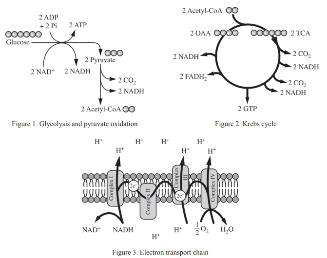 Cellular respiration includes the metabolic pathways of glycolysis, the Krebs cycle, and the electron transport chain, as represented in the figures. In cellular respiration, carbohydrates and other metabolites are oxidized, and the resulting energy-transfer reactions support the synthesis of ATP.