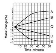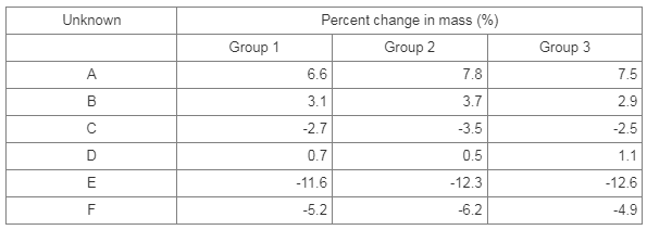 Three lab groups carried out an experiment to identify the correct molarities for five solutions. Each unknown contained one of the following sucrose concentrations: 0.0 M, 0.2 M, 0.4 M, 0.6 M, 0.8 M, and 1.0 M. Each data entry represents the average of 3 sample replications of 1 cm3 sweet potato cubes expressed as percent change in mass after an overnight (24 hr) soak in the unknown solutions. From the data given, which statement most accurately describes what is occurring in response to a particular unknown solution.