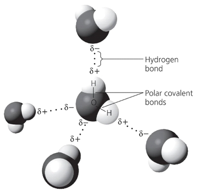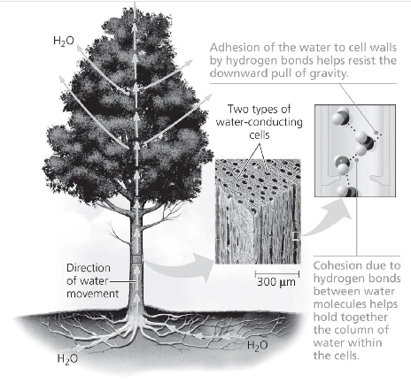 The water molecules in the diagram are attracted to the cell walls of water-conducting cells by adhesion due to hydrogen bonds. What conclusion is supported by this information?
