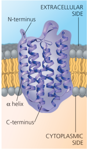 This diagram shows a protein embedded in the phospholipid bilayer of the membrane. Portions of the protein extend into the extracellular and cytoplasmic sides of the membrane.