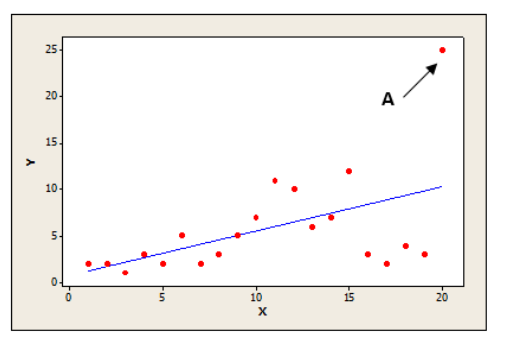 If the point (20, 25) that is labeled A is removed from the data set, which one of the statements below is TRUE?
