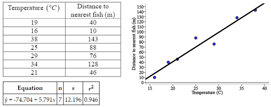 The EverGlow nuclear power plant releases water into Lake Fishbegone every afternoon at 4:51 p.m. Environmental researchers are concerned that fish are being driven away from the area around the plant. They believe that the temperature of the water discharged may be a factor. The data table below gives the temperature of the water released by the plant and the measured distance (in meters) from the outflow pipe of the plant to the nearest fish found in the water on several randomly chosen afternoons. A scatterplot of the data and the least-squares regression line are given.