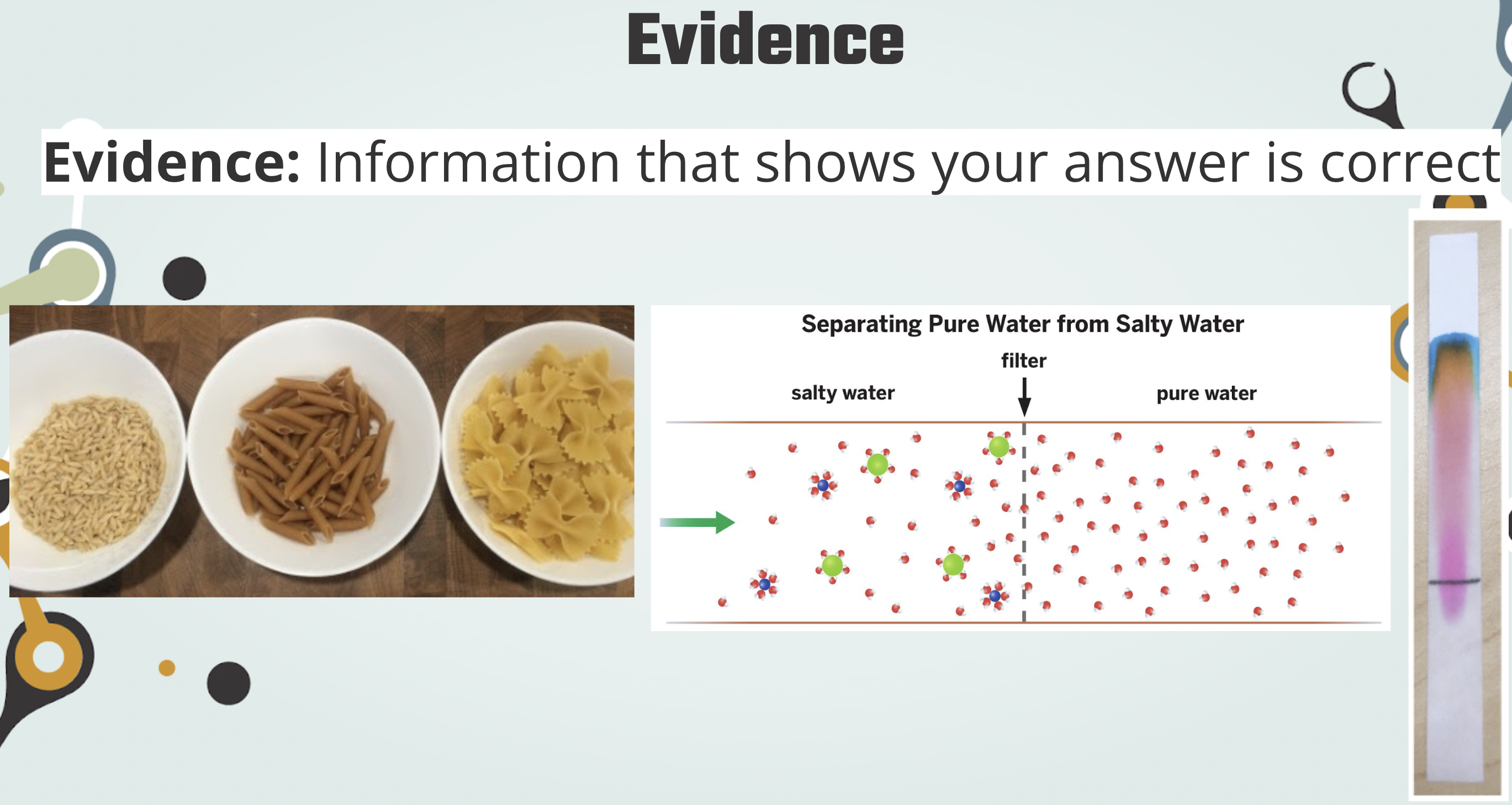 Evidence 2 from class (CHOOSE one piece of evidence: Pasta model, saltwater mixture, food coloring chromatography)