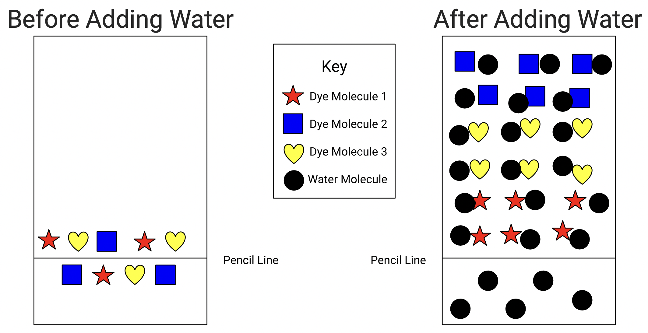 Your friend Sakiya claims that the water molecules cause the dye molecules to change colors, which is why you see different colors on the Chromatography Strip.
