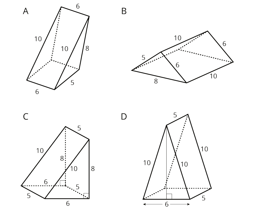 In this net, the two triangles are right triangles. All quadrilaterals are rectangles. What is its surface area in square units? Show your reasoning.