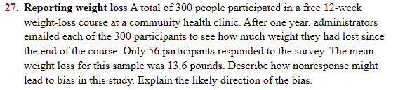 A total of 300 people participated in a free 12-week weight-loss course at a community health clinic. After one year, administrators emailed each of the 300 participants to see how much weight they had lost since the end of the course. Only 56 participants responded to the survey. The mean weight loss for this sample was 13.6 pounds.