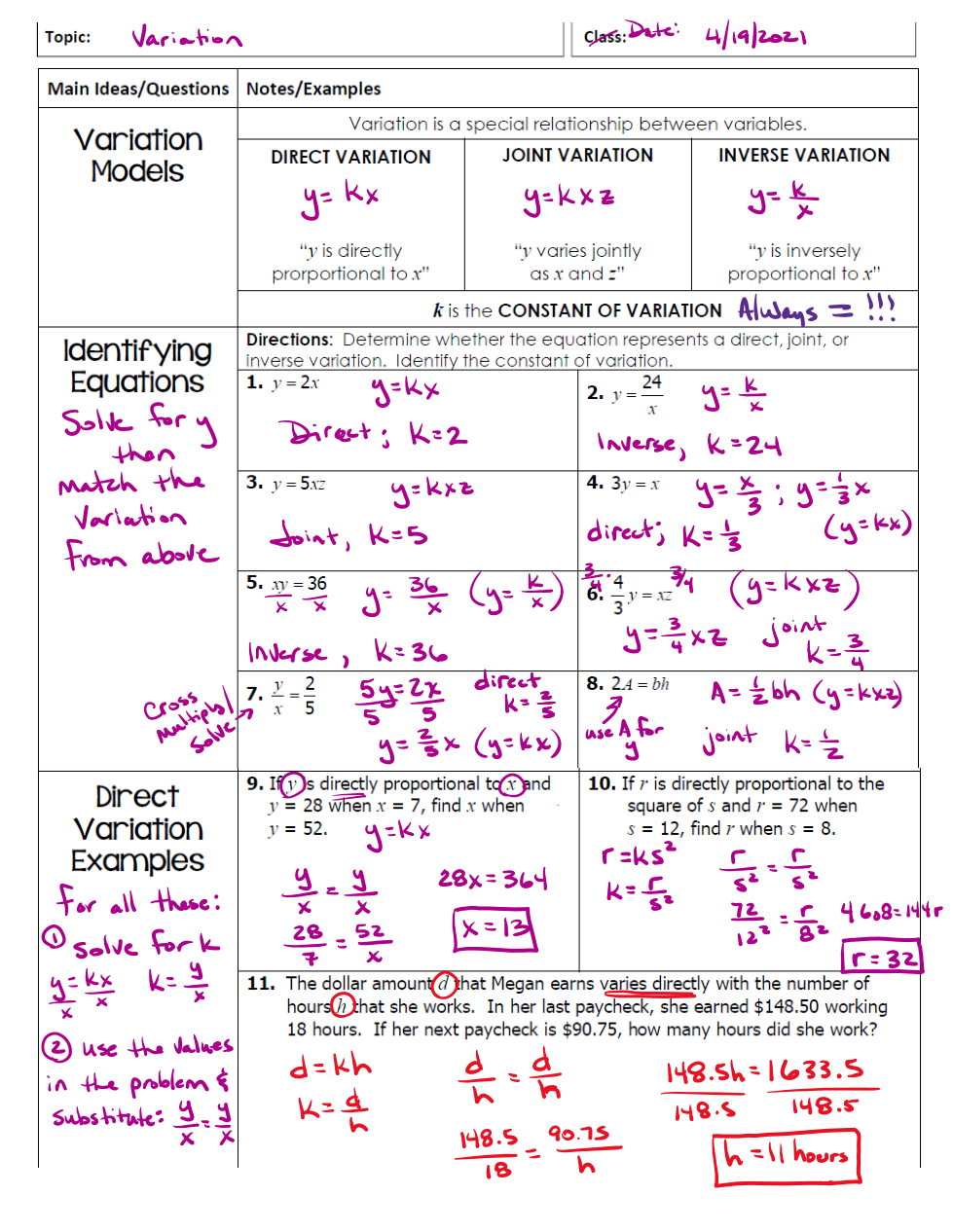 The filled in notes below may help you clarify which type of equation to use based on the question. This is also provided inside schoology.