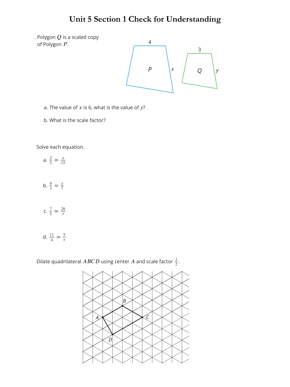 Dilate quadrilateral ABCD using center A and scale factor 1/2.