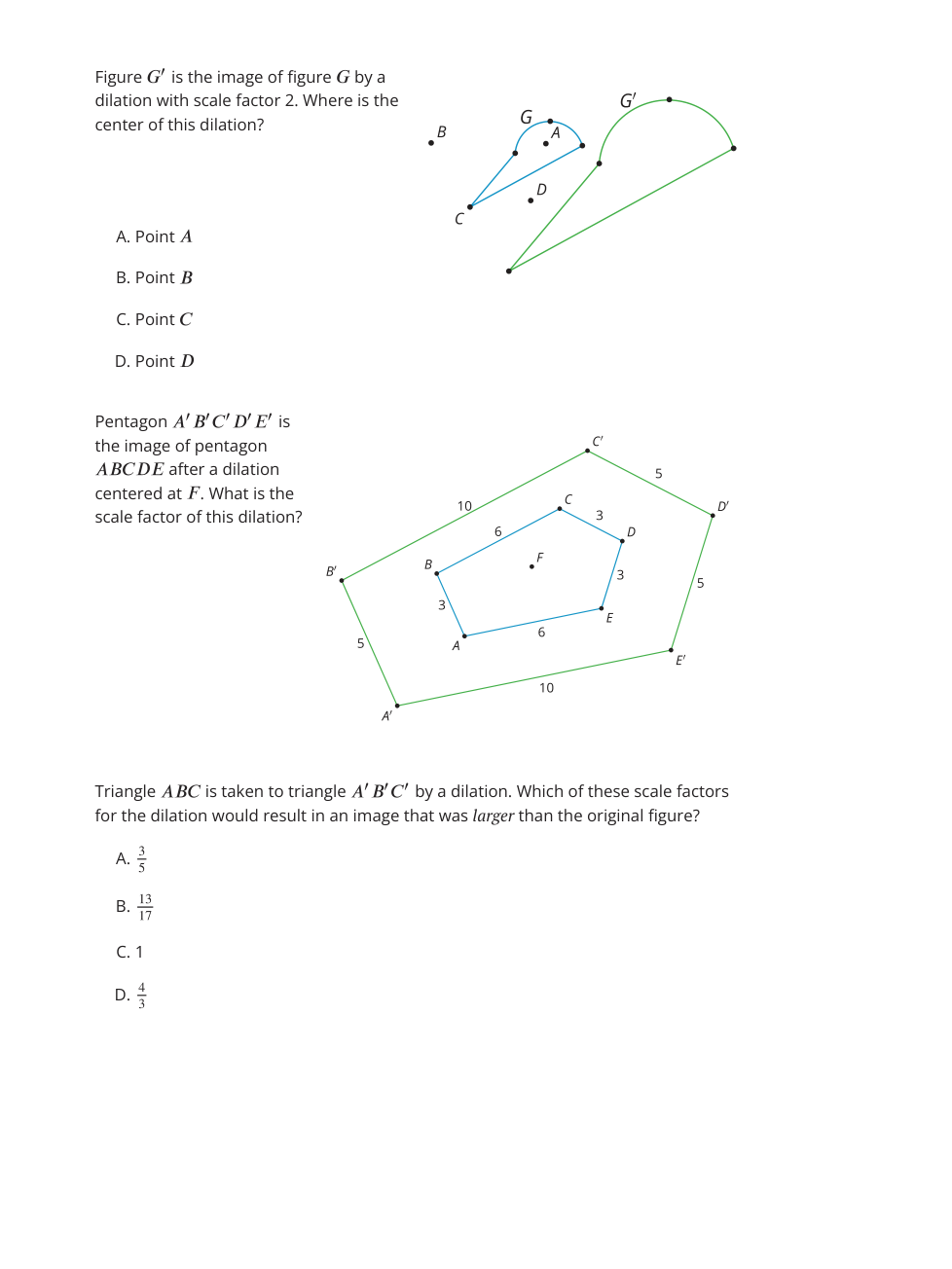 Pentagon A'B'C'D'E' is the image of pentagon ABCDE after a dilation centered at F. What is the scale factor of the dilation?