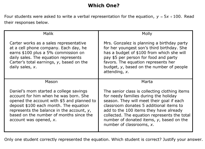 Only one student has the correct equation of y = 5x +100.