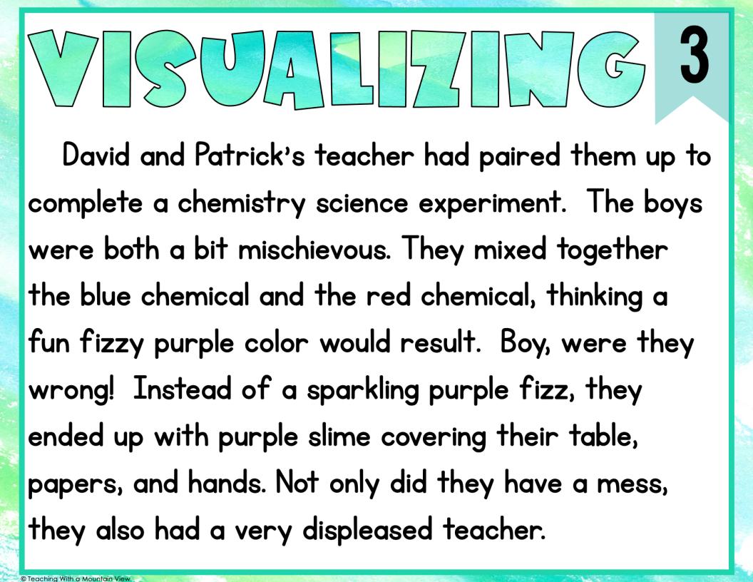 Today, you will practice an important reading skill. Good readers make pictures in their mind as they read. This helps readers to understand what they are reading. You try! Read through the charts below on the right hand side. Then read the short text and draw what you imagine. Provide as much detail in your pictures as possible.