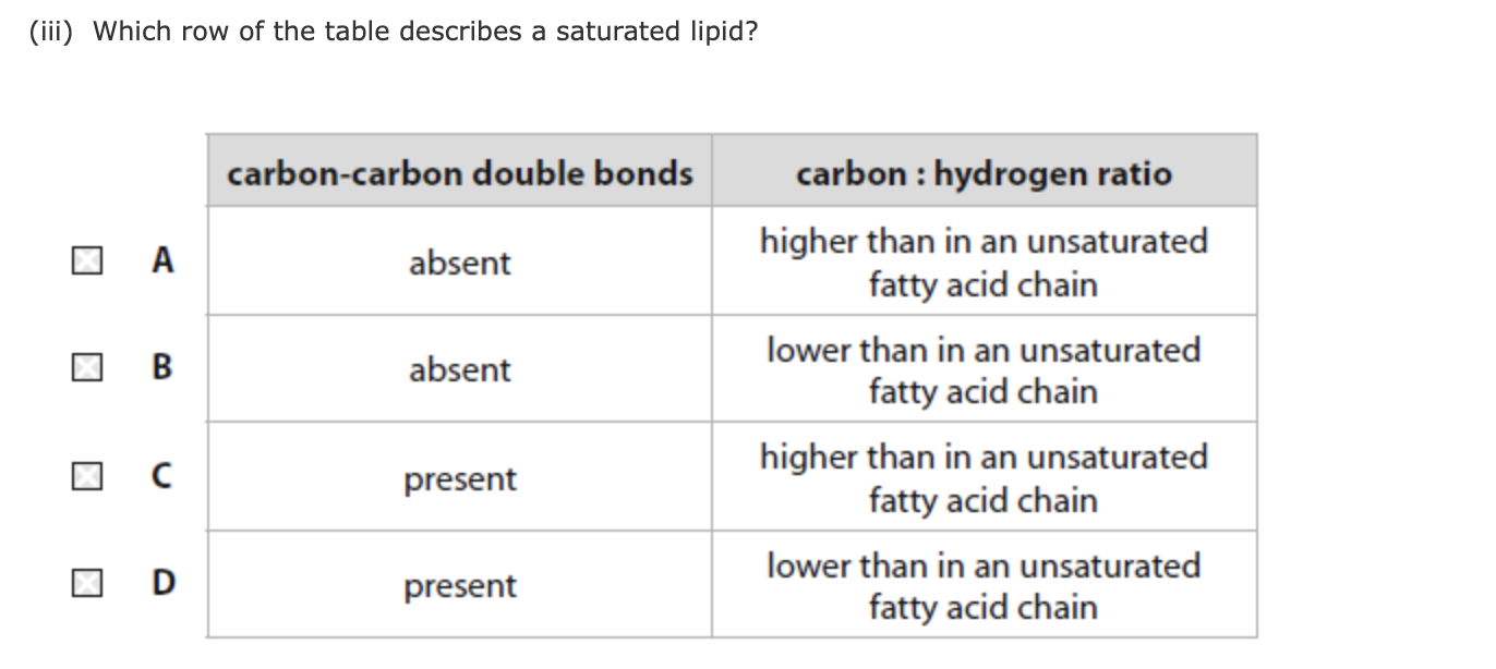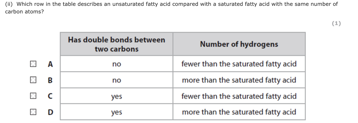 Which row in the table describes an unsaturated fatty acid compared with a saturated fatty acid with the same number of carbon atoms?