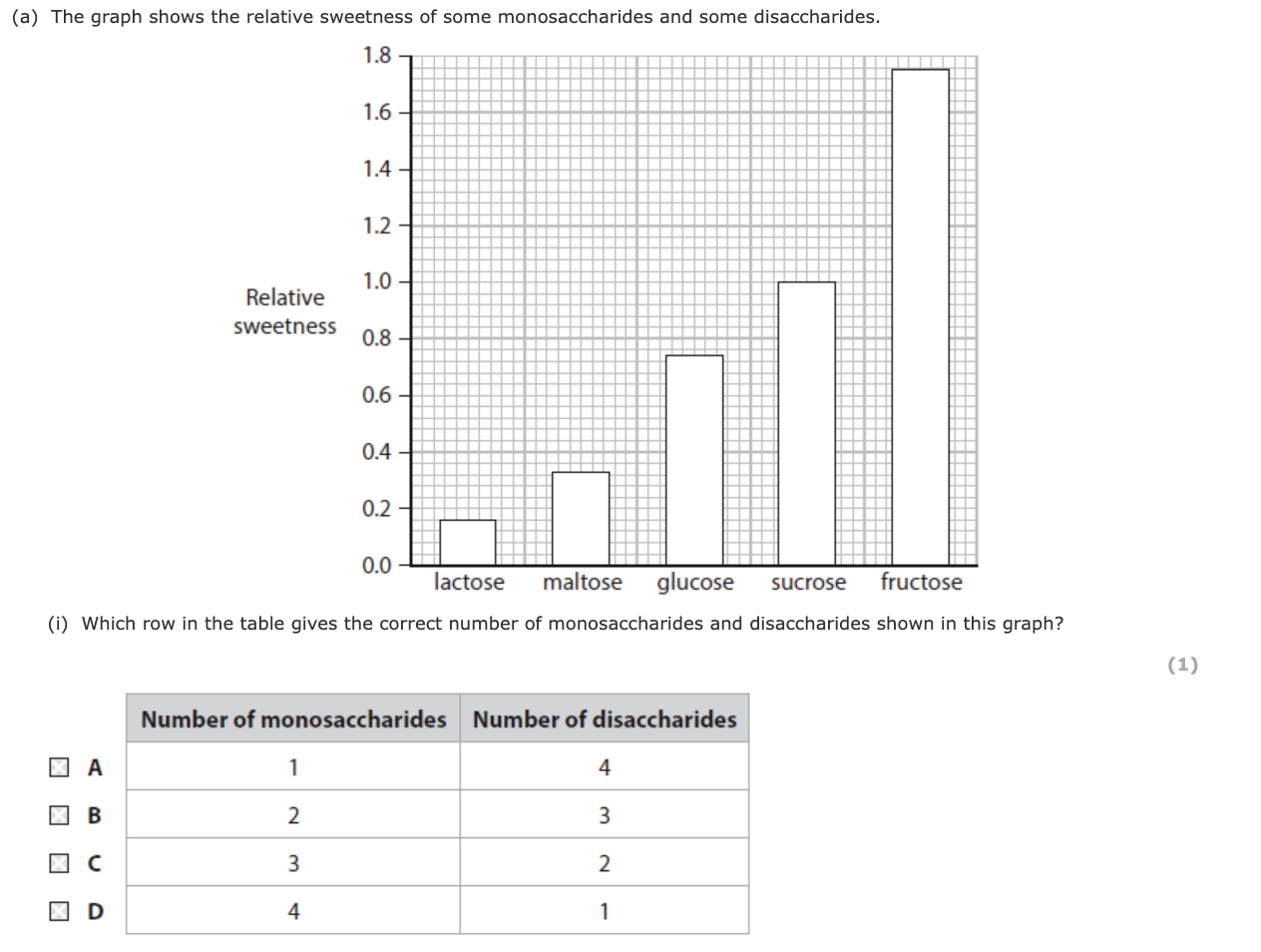 Which row in the table gives the correct number of monosaccharides and disaccharides shown in this graph?