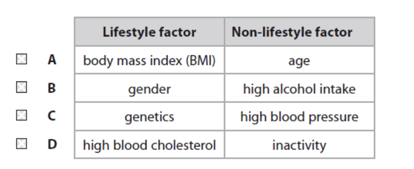 Which row of the table identifies one lifestyle factor and one non-lifestyle factor?