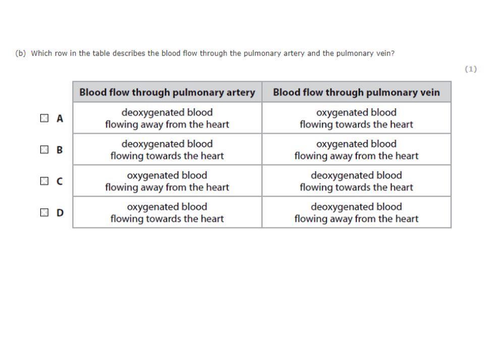 Which row in the table describes the blood flow through the pulmonary artery and the pulmonary vein?