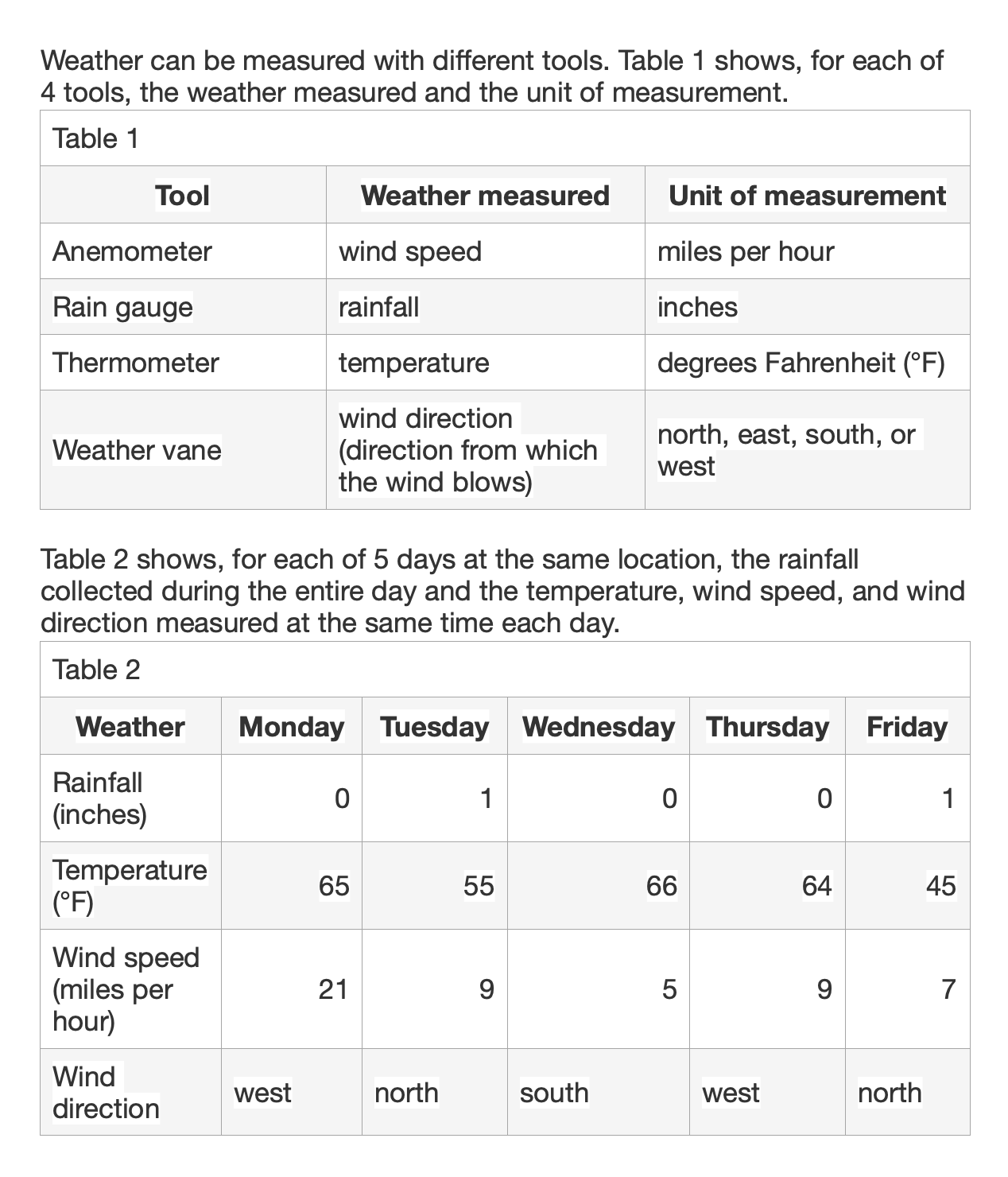 A student claimed that days with temperatures less than 50°F will have winds that blow from the north. Do the measurements in Table 2 support the student’s claim?