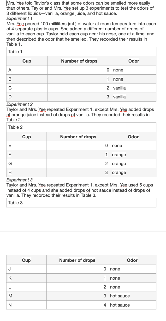 A student claimed that more drops of vanilla than of orange juice would be needed for Taylor to smell each liquid. Which experiments tested this claim?