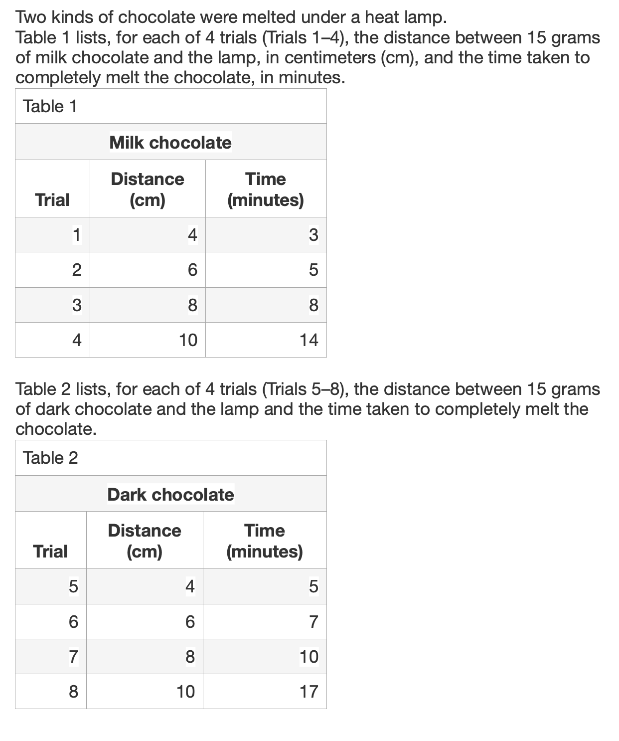 Suppose 15 grams of the dark chocolate had been placed 12 cm from the lamp. Look at Table 2. The time taken to completely melt the dark chocolate would most likely have been: