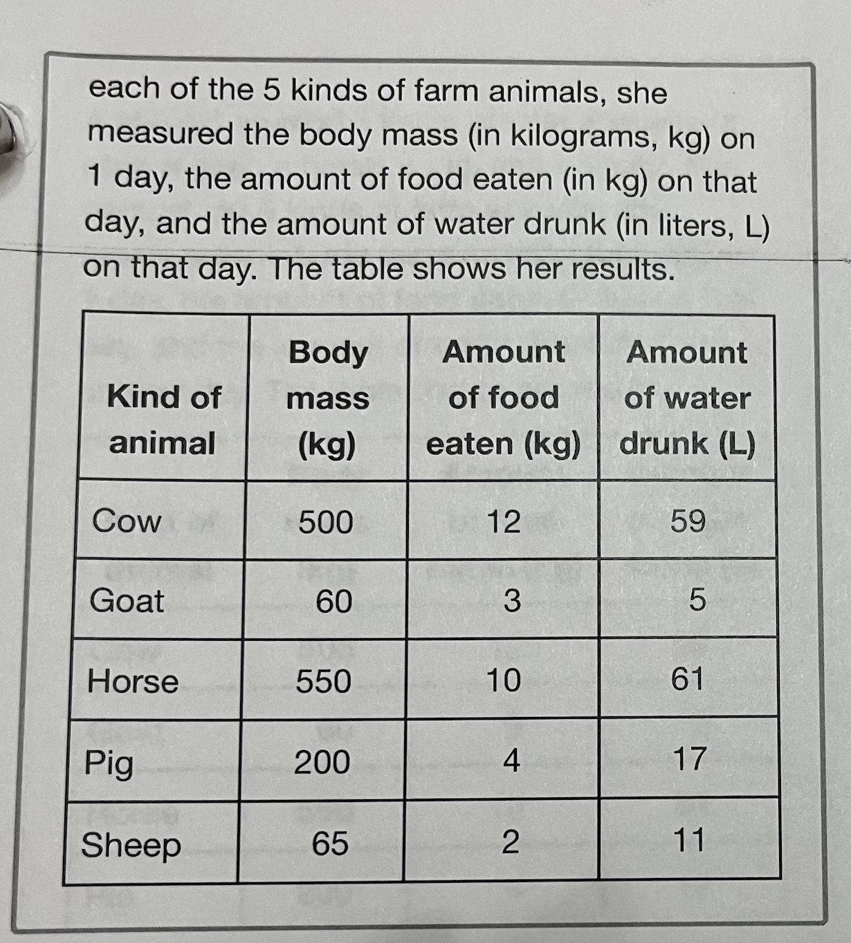 The body mass of the sheep was closest in value to the body mass of which kind of animal?