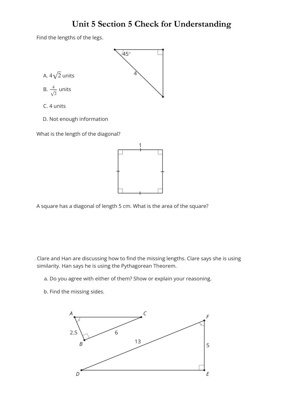 A 45-45-90 triangle has the given side measure(s). Find the possible missing side length(s). The sides are listed from smallest to largest:
