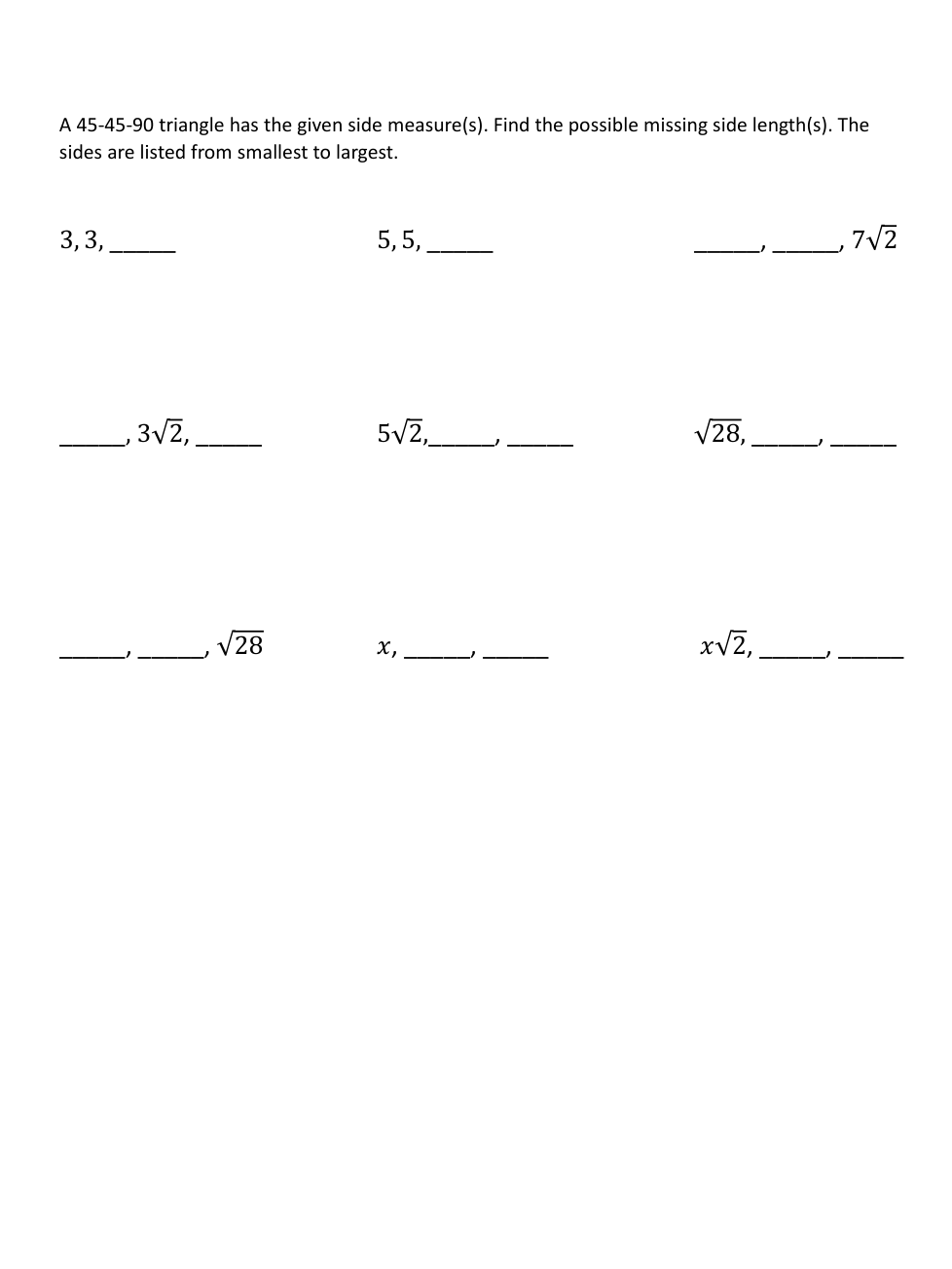 A 45-45-90 triangle has the given side measure(s). Find the possible missing side length(s). The sides are listed from smallest to largest:x, ____, ____(separate your answers with a comma).