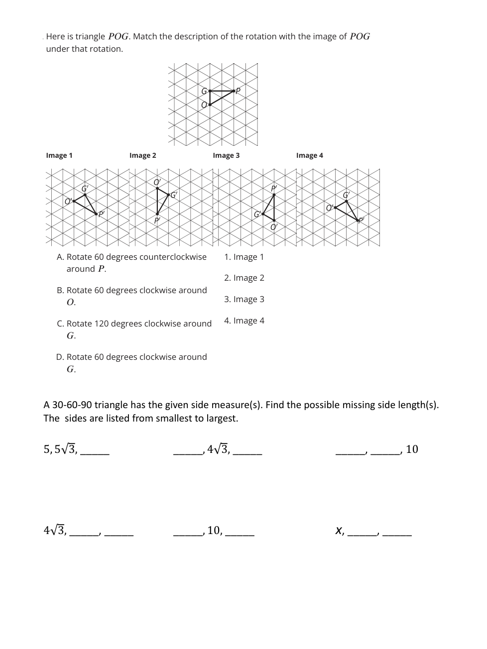 B. Rotate 60 degrees clockwise around O. | arrow_right_alt | Image 4 |