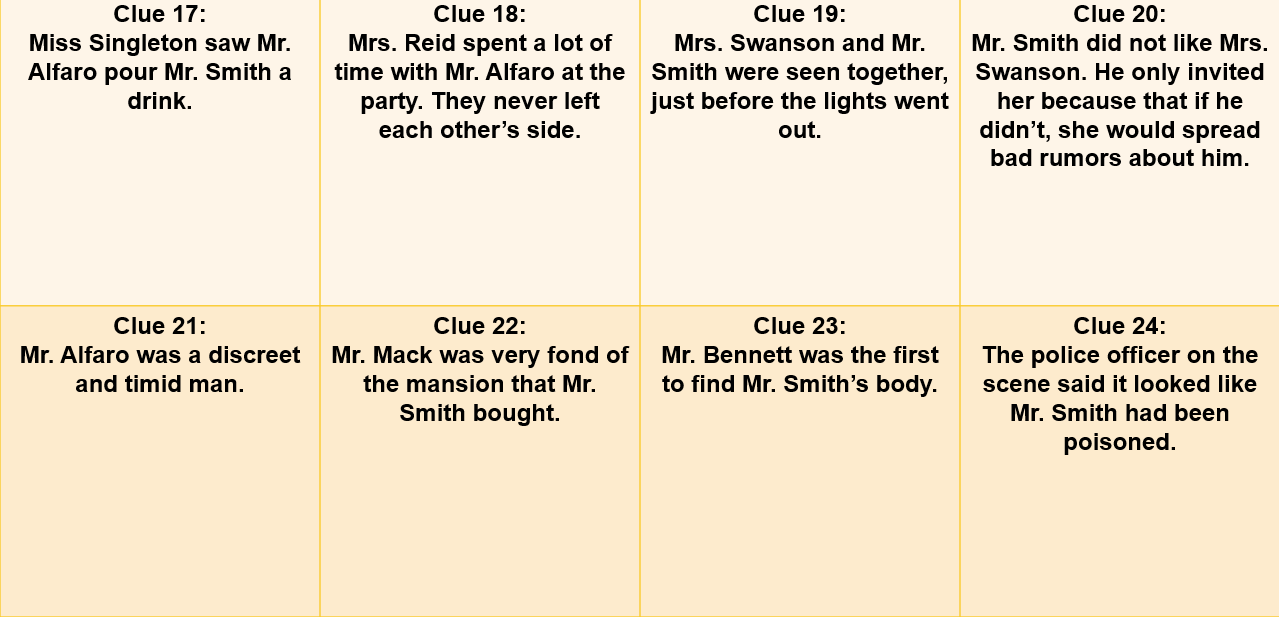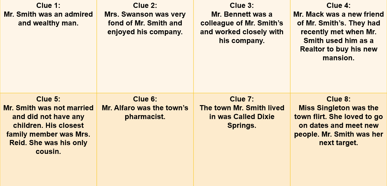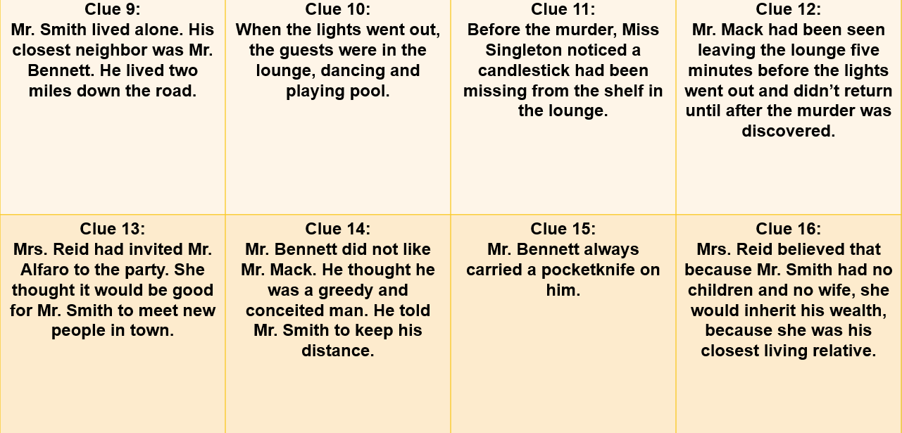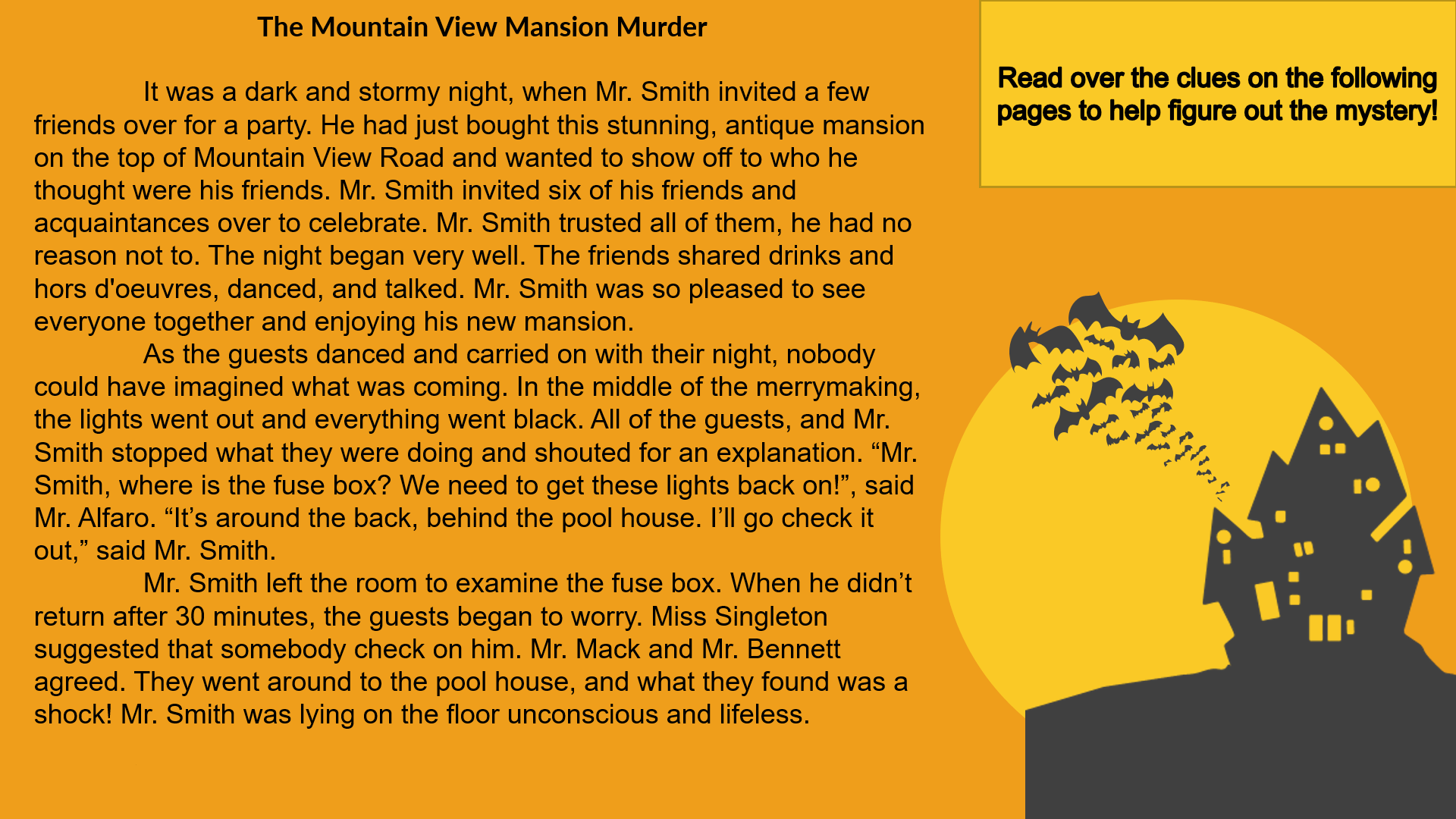 Read the passage and 3 sets of clues. Then answer the questions that follow and solve the mystery!
