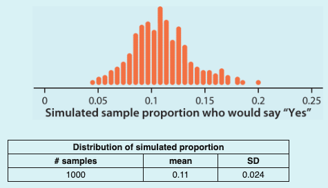 The dotplot shows the proportion who would go to the professor in each of 1000 random