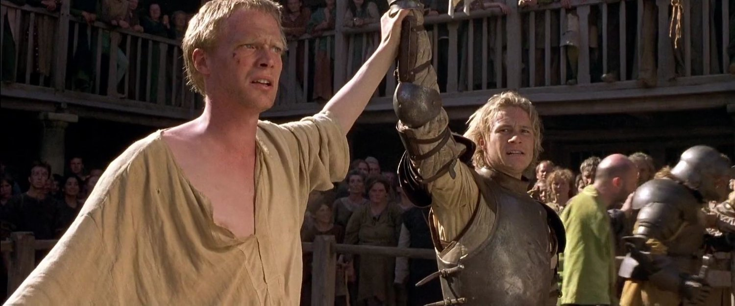 Background: In this movie, a peasant man has disguised himself as a knight in order to participate in chivalric tournaments and pursue the woman of his dreams in a courtly fashion. In this scene, his bard gives a speech to a tournament audience to introduce him as a true "knight," the made-up "Sir Ulrich".