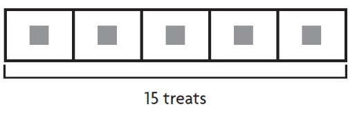 Ed buys 5 bags of treats. He buys 15 treats in all. How many treats are in each bag?