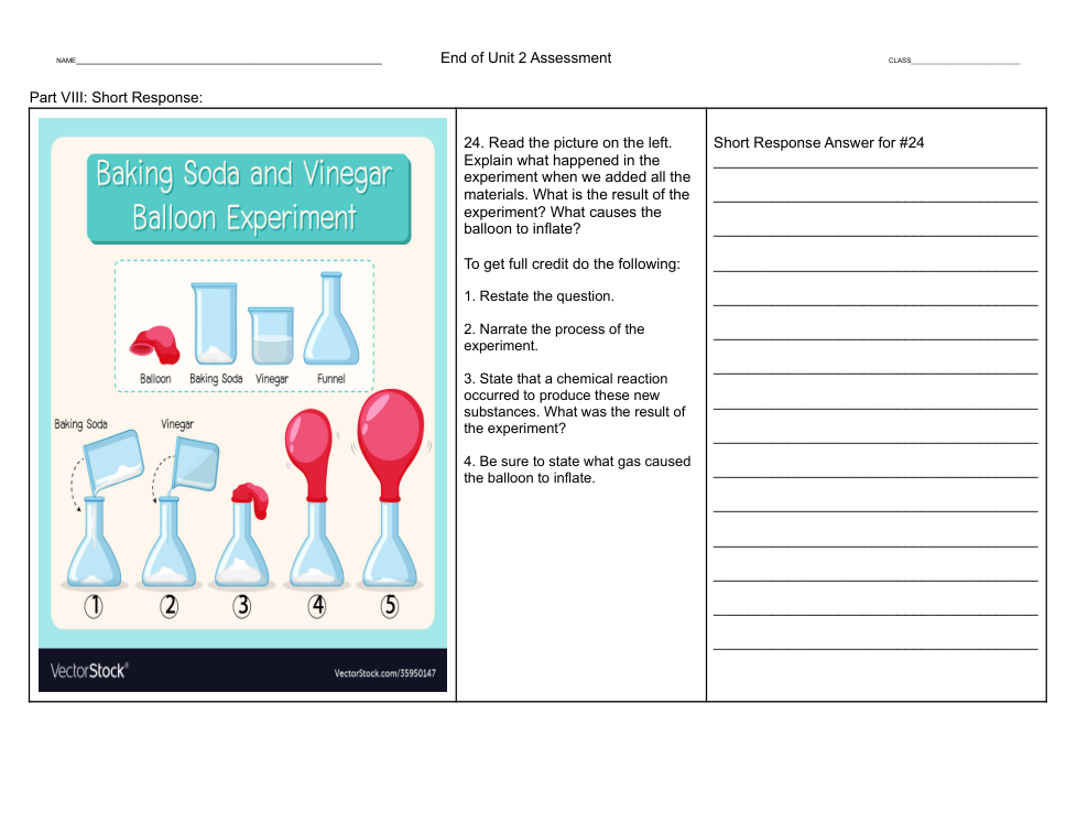 Read the picture on the left.Explain what happened in the experiment when we added all the materials. What is the result of the experiment? What causes the balloon to inflate?To get full credit do the following:1. Restate the question.2. Narrate the process of the experiment.3. State that a chemical reaction occurred to produce these new substances. What was the result of the experiment?4. Be sure to state what gas caused the balloon to inflate.