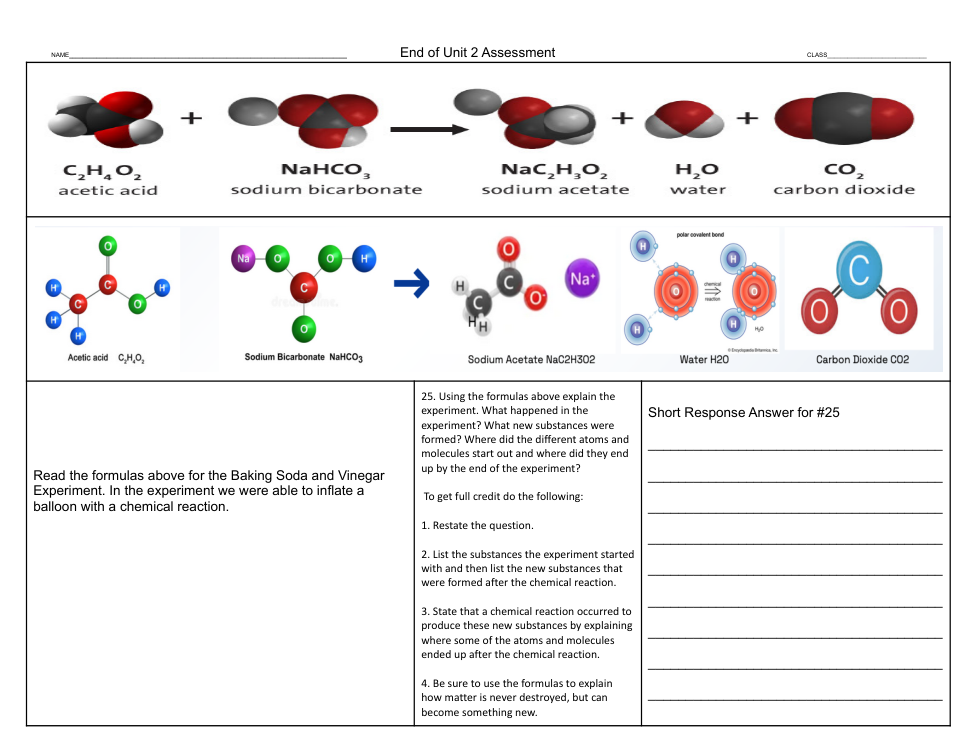 3. State that a chemical reaction occurred to produce these new substances by explaining where some of the atoms and molecules ended up after the chemical reaction.
