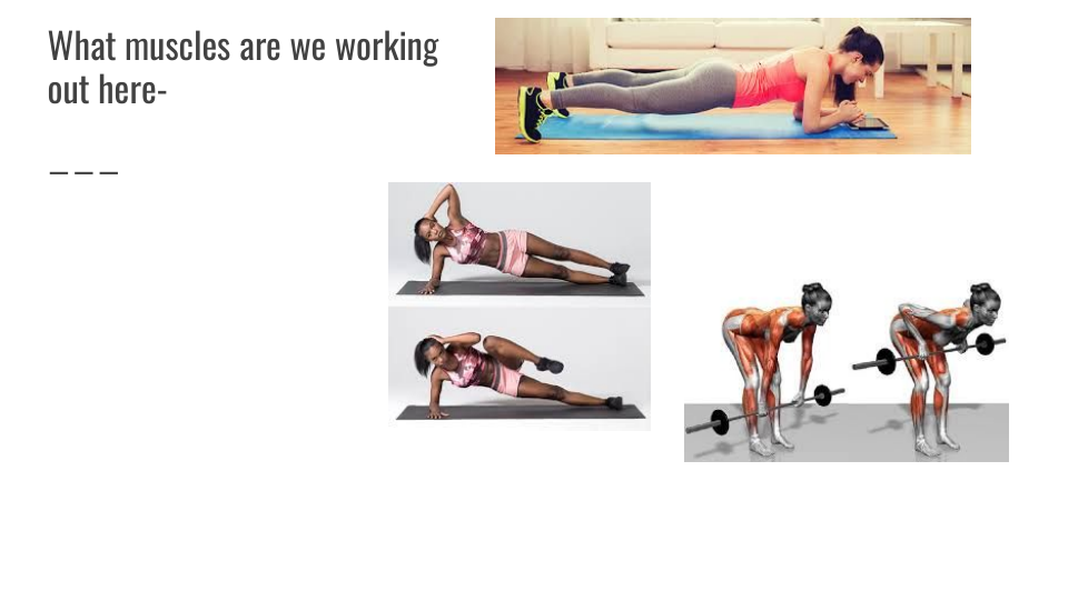 See if you can remember the names of the major core muscles. If not go back to the previous slides for help. List those muscles being used in the pictures.