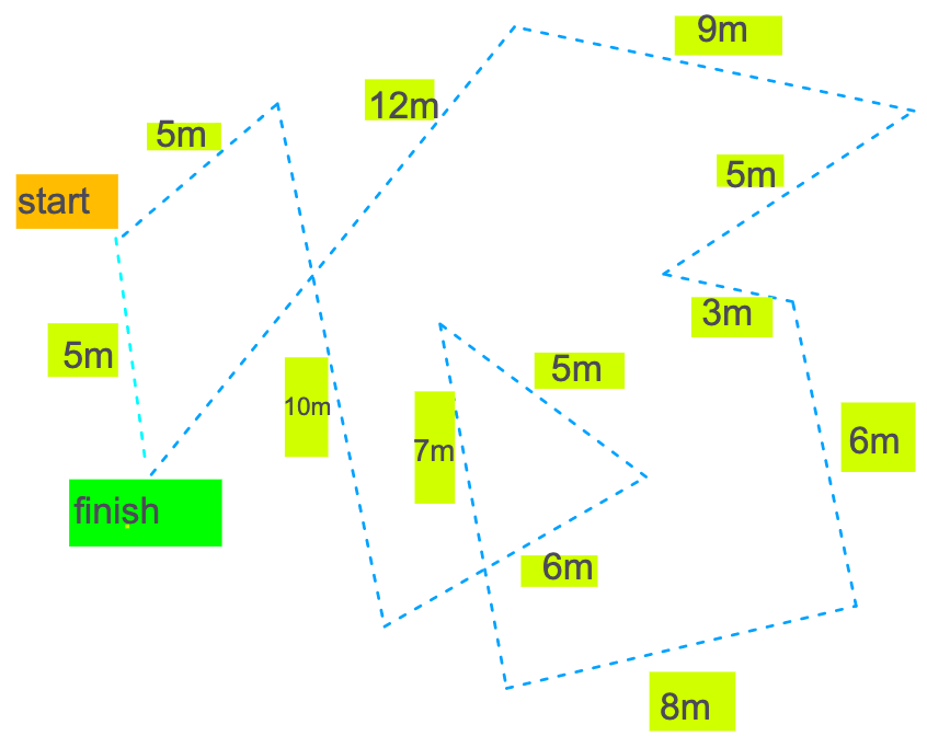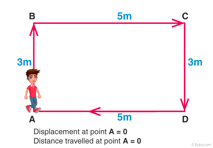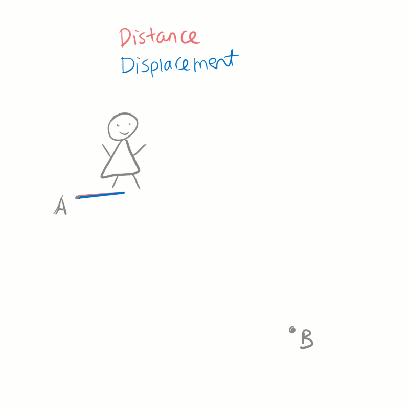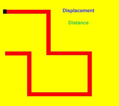 In other words, distance is the total length of path an object has moved. Displacement is just simply the shortest path from start to finish. Notice how in the image below the red line is the distance or complete path take, while the blue line is the shortest path from the girl starts and finishes in her journey.