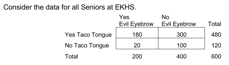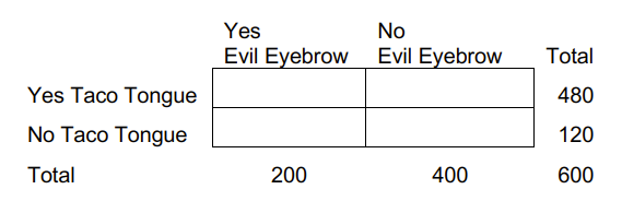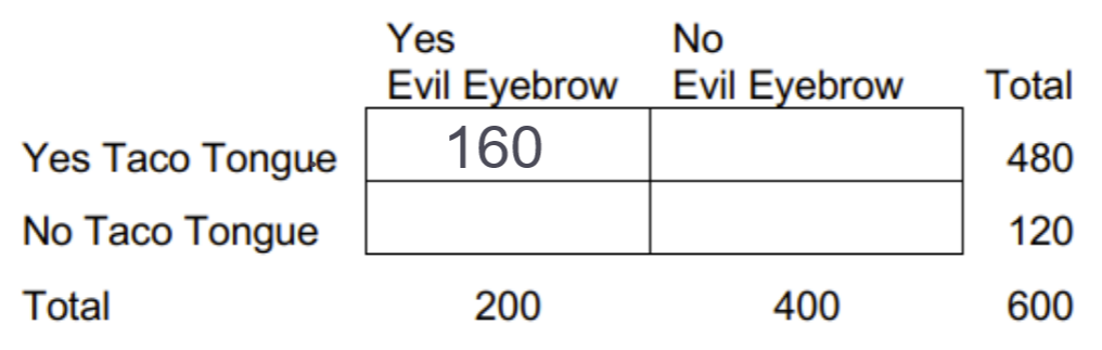 You may be wondering what the data would look like if Evil Eyebrow and Taco Tongue WERE independent. The next few questions will lead you through completing this table.