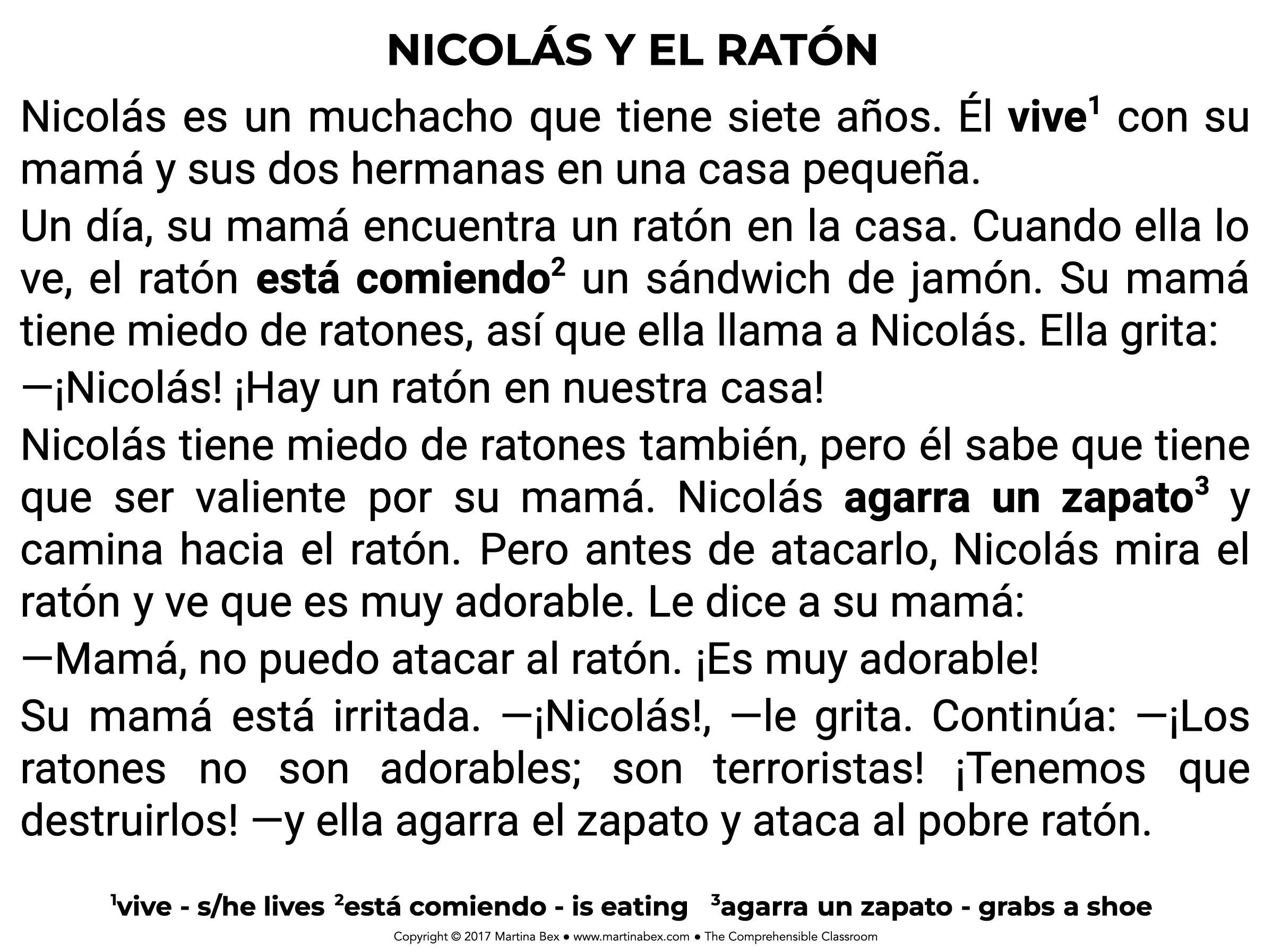 Translate: Nicolás agarra un zapato y camina hacia el ratón.
