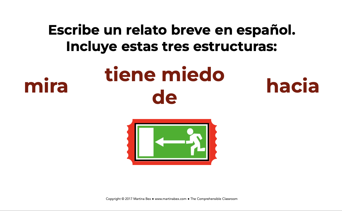 Write a quick story in Spanish that uses the structures tiene miedo de,mira, and hacia.